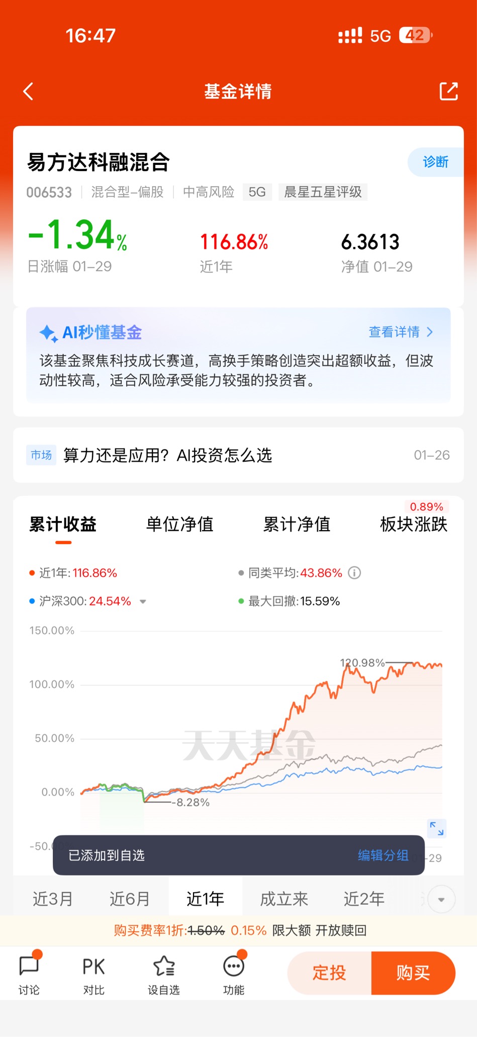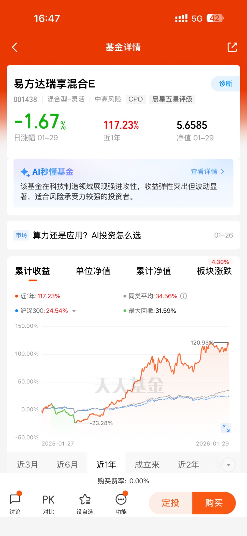 易方达瑞享混合E自2015年6月成立以来,已走过近十年投资历程,截至2026年1月29日,最新单位净值达5.6585元,累计收益高达446.60%,近五年年化收益稳定在22.96%,展现出强劲的长期增值能力。2025年更是其业绩爆发期,全年收益达126.35%,近6个月收益48.17%,近12个月收益飙升至117.23%,大幅跑赢沪深300指数及同类基金平均水平,在2144只同类产品中排名第11位,成为名副其实的“黑马基金”。