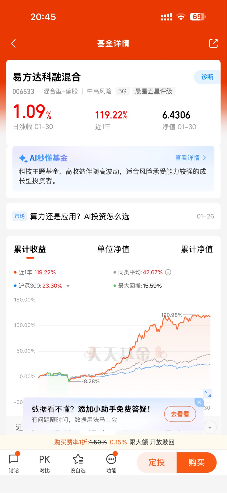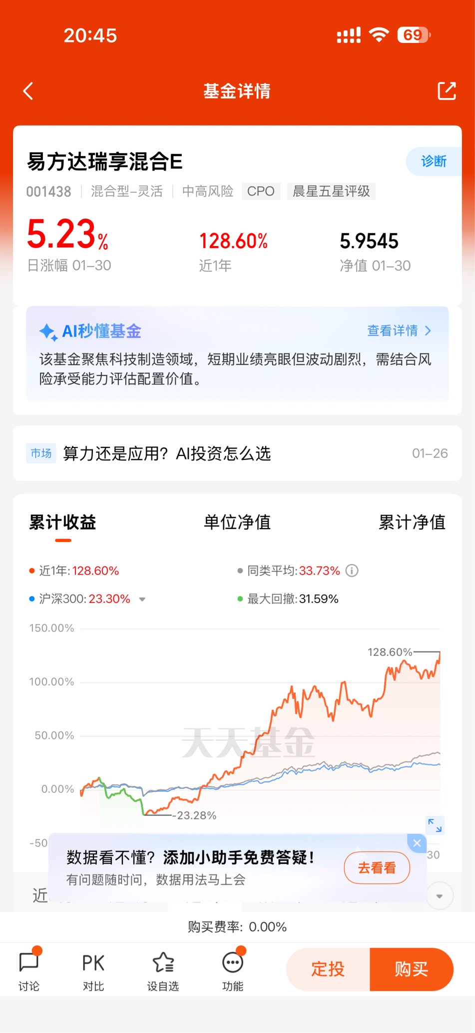 作为一只运作超十年的混合型基金,易方达瑞享混合E的长期业绩堪称亮眼。截至2026年1月30日,基金最新单位净值达5.9545元,成立以来累计收益率高达448.80%,大幅跑赢同期业绩比较基准的102.21%。从不同时间维度看,基金的收益爆发力尤为突出:近6个月收益率达54.43%,近12个月收益率更是飙升至128.60%,在同类基金中处于领先水平。