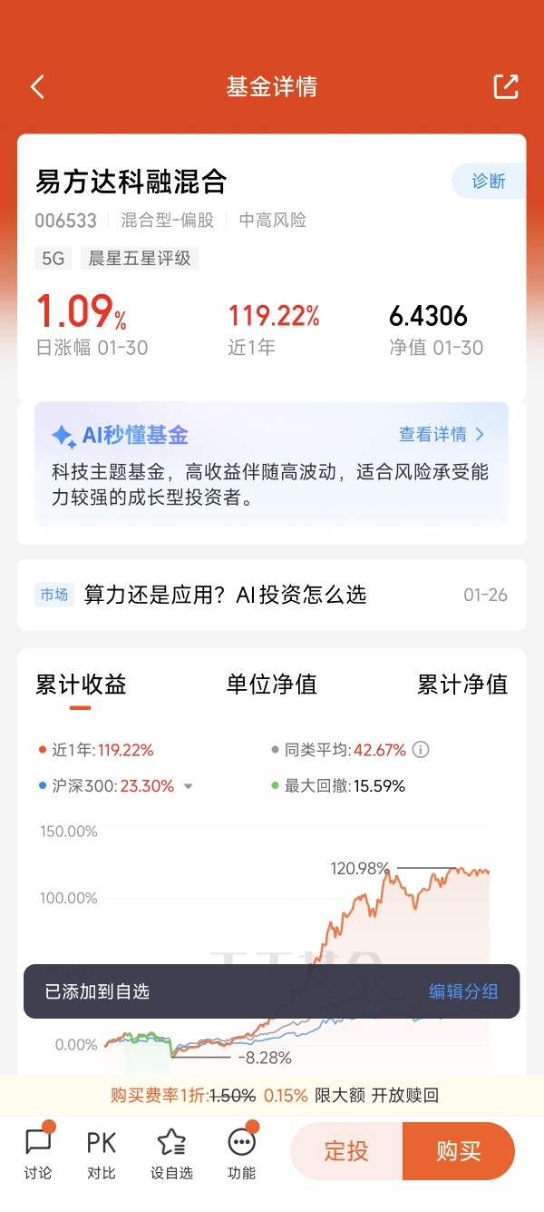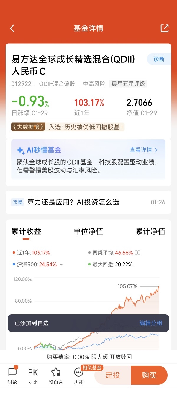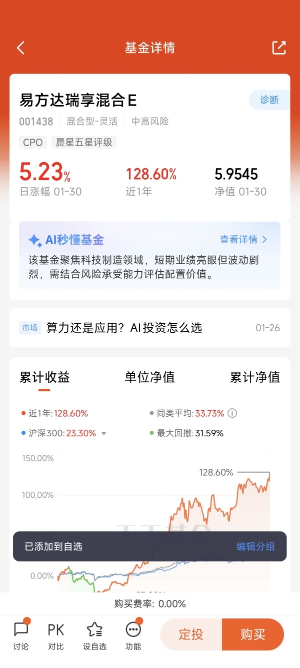 我站在2025年的末尾,回望自己的基金账户:全年36%的收益,像一枚沉甸甸的勋章。这数字让我欣慰,却不足以让我狂喜。因为我知道,在同一片投资星空中,有一束更为耀眼的光芒——易方达瑞享混合E(001438),它以全年 126.35% 的净值增长率,在三千多只同类基金中高居前列,定义了什么才是极致的“超额”。