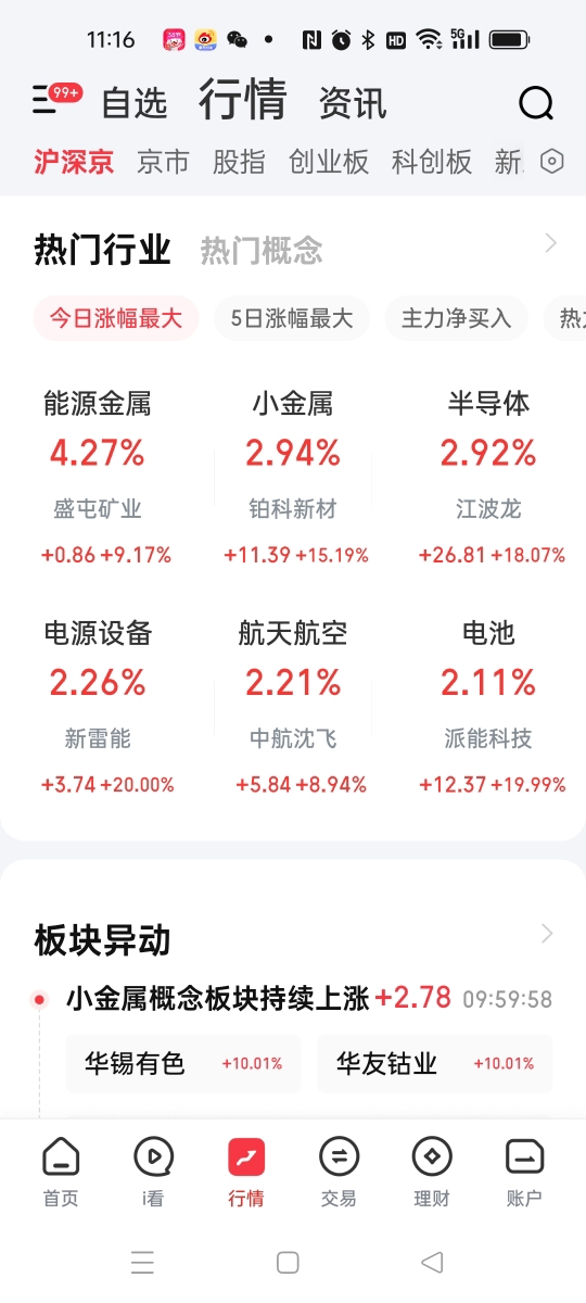 上午几大指数都是红盘的,其中军工、能源金属、半导体、小金属、电源设备、电池板块是上午的热点。截止到11:20分左右,涨跌分布是2920:2010家。