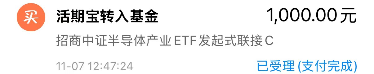 加仓1000元$招商中证半导体产业ETF发起式联接C(OTCFUND|020465)$,半导体指数正在探底回升,此时不补仓更待何时?经过近期的这一波回调,已经有很多的恐慌盘兑现跑路,昨天触底后放量大涨,有人卖也有人在买,筹码交接比较成功,近两日的趋势来看,继续向下的成交量也不多,因此继续下杀取量已经没有意义,再往下可能就要被别人抄底了,小羊认为短期内受益于市场对于半导体行业技术突破预期的提前反应,叠加估值急需 修复的需求,探底反转大概率是必然的趋势了,小羊一直都是看好半导体的,在设备端国产化加速和存储芯片涨价周期的双重支撑下,小羊非常期待4000点以后半导体的行情,近期在回调阶段个人也是不断补仓,目前收益2.73%,该基金重点布局半导体设备和材料及芯片设计等核心产业链环节,持股集中度高,行业内覆盖面较广,个股风险风险相对较低,短线爆发力强,近三个月收益43.47%,具有高弹性和高成长性特征,目前半导体在回调后刚刚开始上涨,今天小幅震荡,趁此机会小羊再次补仓,现阶段半导体已经兼具外部压力催化国产替代、AI需求拉动行业景气和业绩兑现的三重利好,上涨空间巨大,小羊现在能做的就是有机会就补仓。
