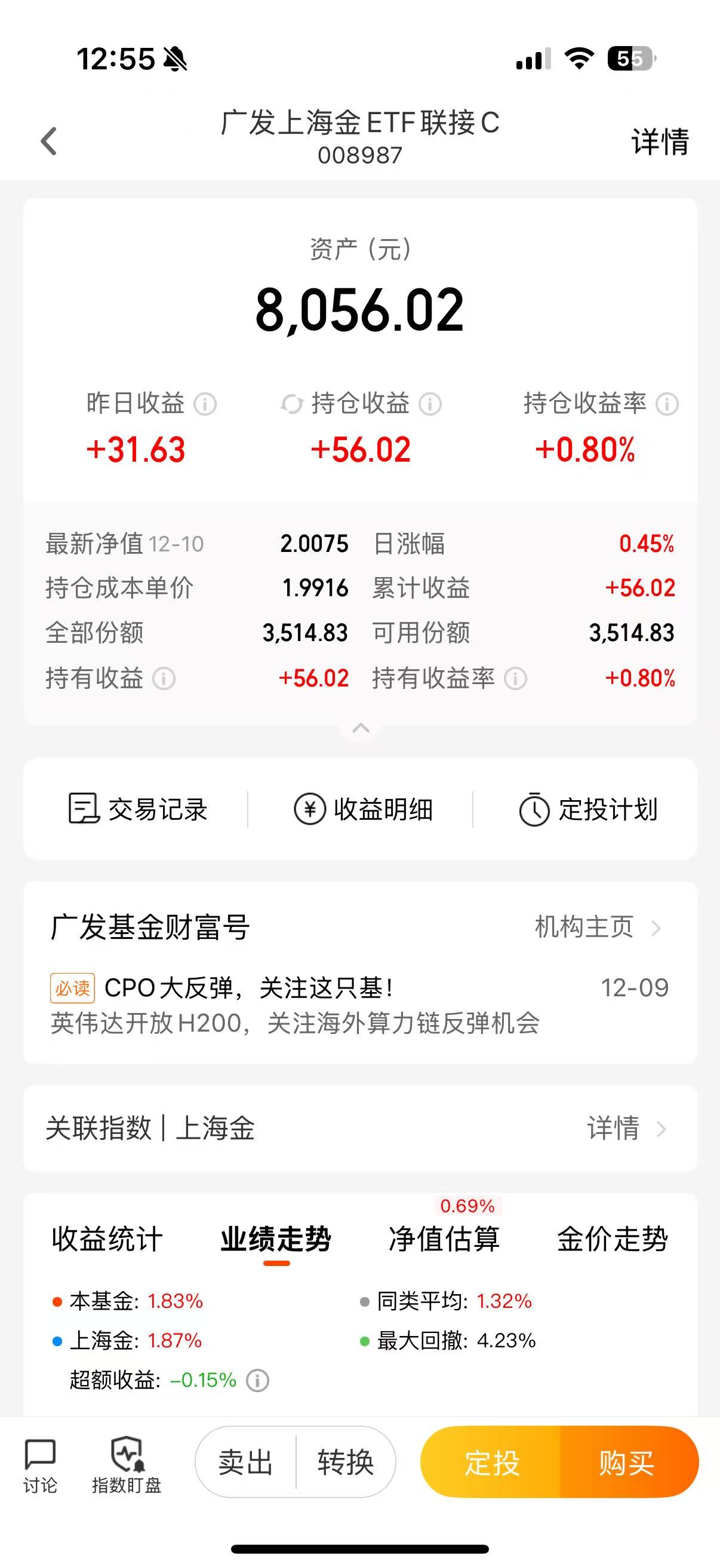 今日加仓1000元$富国创新科技混合C(OTCFUND|011120)$,已经连涨6天了,涨幅累计13%,单日涨幅高达7.08%,小羊从8月份定投以来,目前收益已经20.16%,这爆发力也太强了,今日估值小幅回调,今日小羊继续定投,该基金的高爆发力源自于其持仓聚焦今年最火的光模块等新兴成长硬科技领域,持股集中度高,前十大重仓集中度56.99%,覆盖通信、电子、光模块、算力、PCB等科技细分赛道,叠加其灵活且优秀的调仓能力,近三年换手率达到399.25%,方向正确且根据市场风向调整个股,超额收益能力较强,近一年收益率127.47%,同类排名前0.41%,近期市场开始反弹,依旧是CPO领涨,主线没有变,因此今日小羊继续定投。