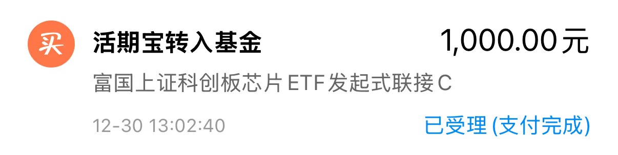 今日买入1000元$富国上证科创板芯片ETF发起式联接C(OTCFUND|023652)$,今天半导体领涨,芯片涨的也不错,小羊就说布局科技没有错,布局芯片更没有错吧,逻辑面上,近期AI芯片需求释放,英伟达收购Groq技术授权强化AI推理布局,产业升级和技术突破催化赛道反弹,叠加大盘即将突破4000点,压力位的突破依旧需要科技与大盘共振,因此芯片上涨空间很大,当下布局是提前把握机会,该基金覆盖半导体设备、材料、芯片设计、制造和封装测试等核心环节,覆盖产业面广,且行业集中度高,前十大重仓占比约70%,充分受益于国产替代和技术升级优势,近6个月收益42.05%,远超同类平均值22.78%,超额收益能力较强,作为ETF联接基金,交易透明度高,费率低,降低了小羊在操作中的交易成本,适合中长期配置,目前小羊正在慢慢的收集筹码,今日继续补仓,博弈4000点以后行情。