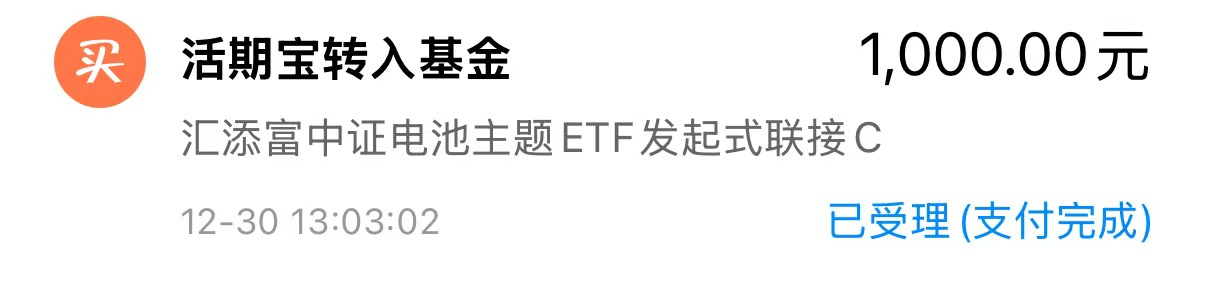 今日买入1000元$汇添富中证电池主题ETF发起式联接C(OTCFUND|012863)$,A股即将冲击4000点,电池6连涨后回调,正是布局的好机会,涨的时候不敢追,跌了难道还不敢补仓吗,目前国内储能商业模式逐步清晰,叠加欧洲碳排及新兴市场储能需求增长,推动电池需求端扩张,电池赛道逻辑面稳定,上涨空间大,潜力高,年前布局把握春季躁动行情,小羊选择费率最低的汇添富中证电池指数,该基金跟踪中证电池主题指数,精选50家锂电全产业链龙头,精准布局储能+固态双主线,指数储能含量达26%,固态电池含量达42%,市场储能+固态电池含量最高,近一年收益超58%,综合费率仅0.45%,同类最低,小羊布局后目前收益10.56%,今日抓住回调的机会再次补仓。