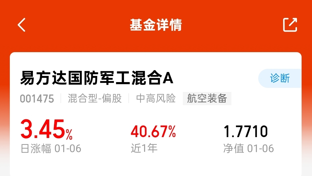 2026年军工行情正火,易方达国防军工混合A(001475)表现亮眼!$易方达国防军工混合A$ 连涨3天,周二涨3.45%。近1年涨幅超40%,近3月也涨了9%,业绩远超同类平均。它重仓中航光电、航天电器等军工龙头,覆盖战斗机、发动机、卫星等核心领域,现在军工板块受政策、订单双重驱动,好时机!