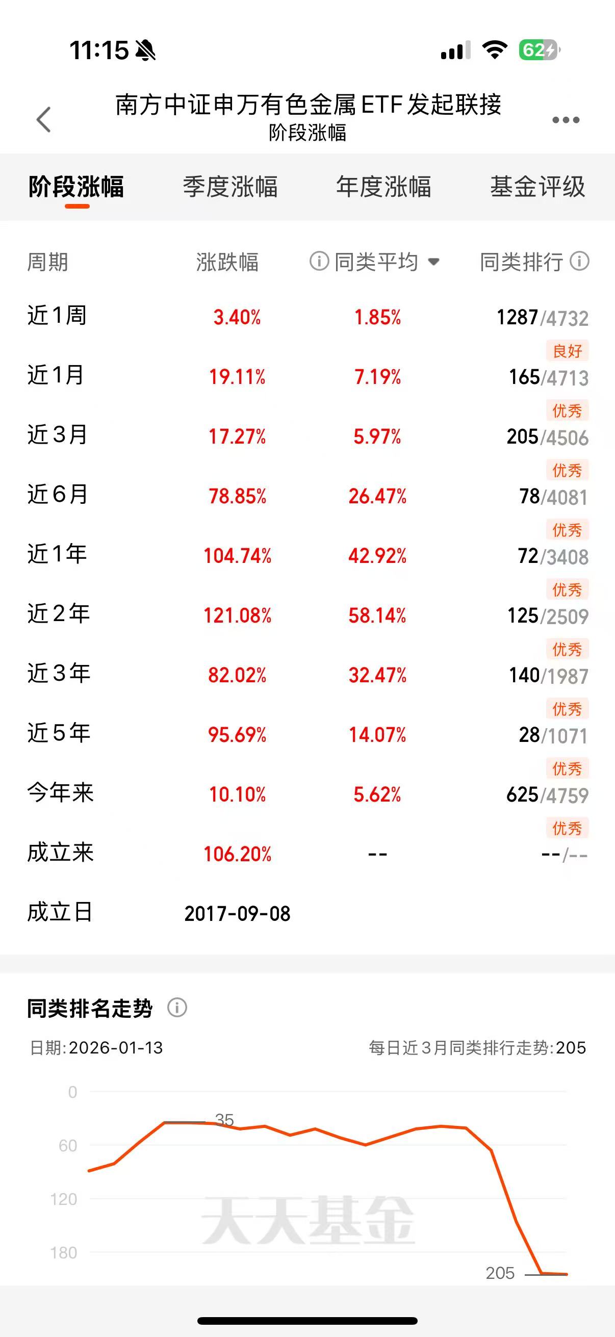 加仓1000元$南方中证申万有色金属ETF发起联接C(OTCFUND|004433)$,爆发了,有色金属持续大涨,再不追真的追不上了,有色金属小羊一直在关注,想等它回调下再进场,结果越等越高了,不能再等了,目前小羊持仓还没有有色方向,亏大了,今日追涨上车,该基金跟踪指数,涵盖工业金属、能源金属、贵金属等,覆盖铜、铝、锂等50只成分股,兼具传统基建需求和新能源转型驱动,短期内受到贵金属价格上行,金银铜铝大涨价、全球铜矿供应紧张叠加新能源发展市场需求等多重因素影响,近一年大幅上涨,收益率达到104.74%,弹性大,已经实现了估值翻倍,同类排名前2.11%,最大回撤12.71%,显著优于同类平均水平,具有较高的超额收益能力和风险控制能力,当前已经连涨3天了,今天又估值上涨2.23%,本着牛市中强者恒强的原理,今日小羊继续追涨强势方向,上车南方有色金属。