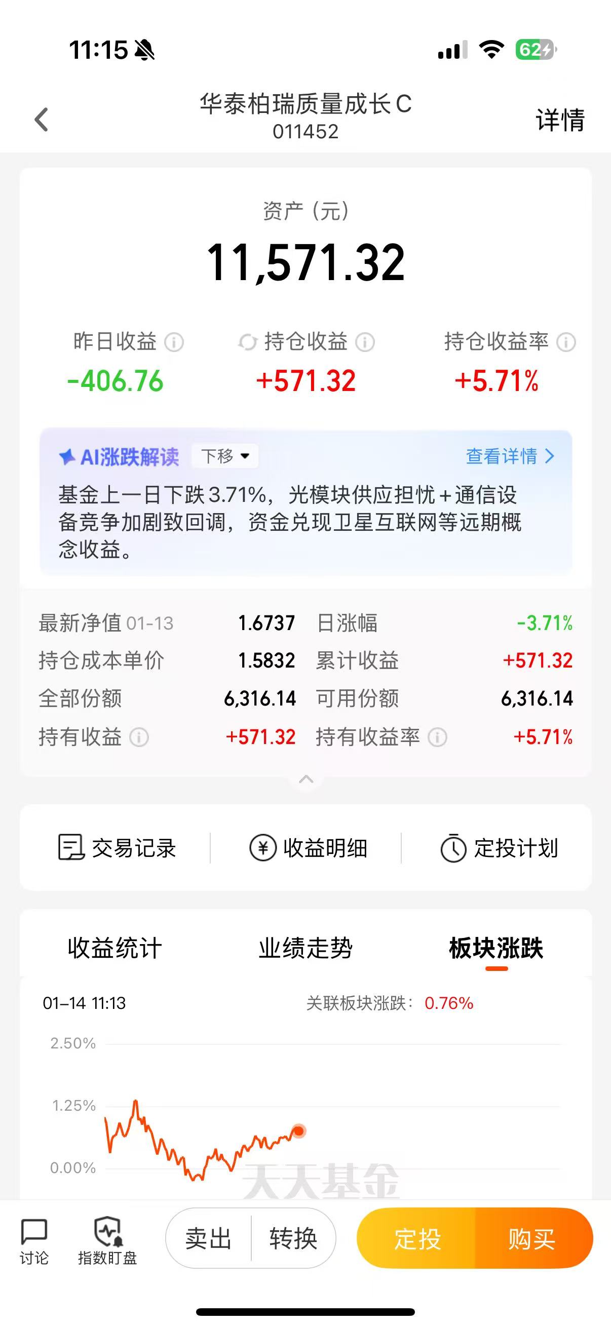 今日加仓1000元$华泰柏瑞质量成长C(OTCFUND|011452)$,市场爆了,成交量持续释放,创历史新高,昨天收盘已经3.7万亿了,接下来4200点很快要突破了,科技方向依旧是全线领涨,加仓,继续加仓,没有别的选择了,该基金聚焦通信、电子两大科技领域,持股高度集中,两者布局占比67%,重仓光模块、pcd等AI硬件核心环节,例如中际旭创、新易盛等行业龙头,充分受益与AI算力建设和科技政策支持,与产业趋势高度重合,符合这次科技牛的趋势,近一年涨幅130.7%,同类排名前0.59%,超额收益能力十分优秀,近3年换手率657%,科技龙头的集中叠加高频调仓的灵活策略,更能捕捉这次的行情,当下回调后正是定投的黄金坑,今日小羊继续定投上车。