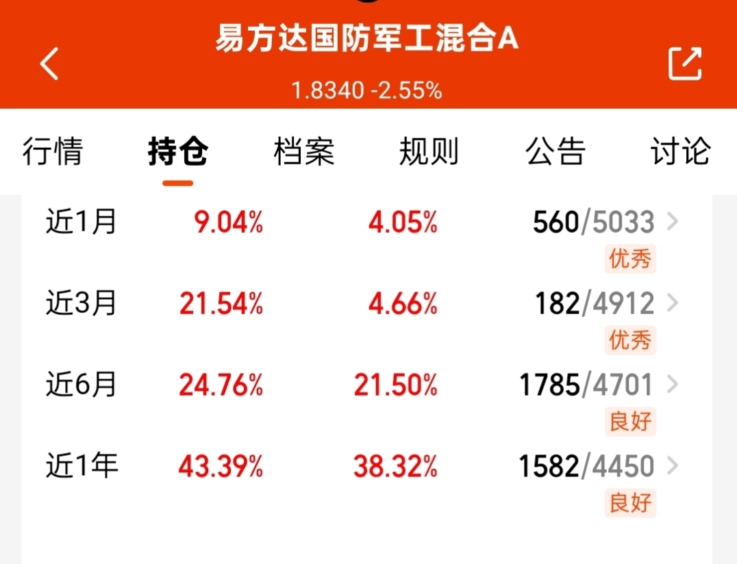 易方达国防军工混合A,近一年涨幅近44%,持仓聚焦国防军工核心领域,航空航天、信息化、新材料等细分方向,与商业航天、低空经济等产业热点高度契合。当前军工板块受益于政策红利与技术突破,商业航天、军贸及“两机”产业链(航发与燃机)需求共振,长期成长路径清晰。