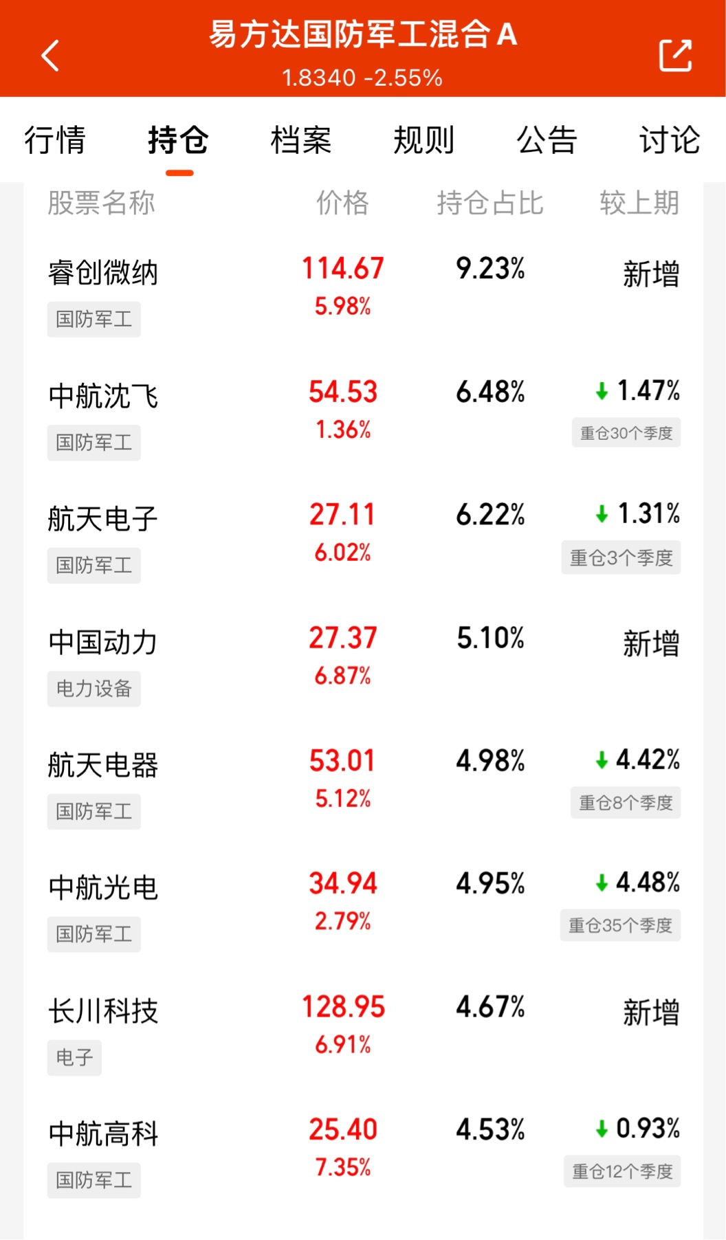 今天市场回暖,马斯克SpaceX与xAI合并的消息传来,航空军工板块应声大涨,商业航天概念站上风口。我选择加仓$易方达国防军工混合A$ ,它的十大重仓聚焦航空航天装备,在国防高确定性基本盘上,布局了多只直接或间接涉及商业航天的个股,攻守兼备,适配当前市场行情。