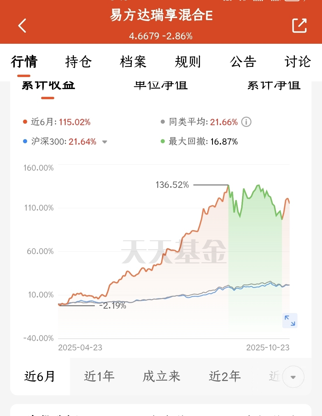 最近股市震荡,各个基金也是出现了一定程度的回调,不过$易方达瑞享混合E$ 反弹的还挺快。该基基金经理凭借前瞻性投资能力,在10年运作中精准把握成长机会,近六个月涨幅115.02%,业绩持续领先同类。近期科技板块反弹行情中,CPO概念领涨市场,本产品凭借优质持仓结构实现超额收益,涨幅显著优于竞品,再次验证了基金经理优秀的择时选股能力。