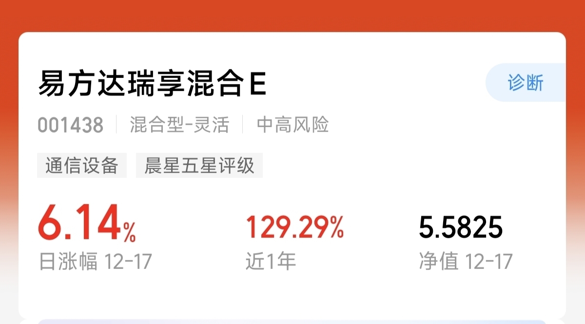 今天的科技又出现了回调,不过这个位置我依然看好!在全球科技持续爆发的趋势下,当前国产科技整体位置不高。而且随着人工智能发现,CPO算力等相关产业链长期的景气度高。$易方达瑞享混合E$ 这只主动的科技混合基金。昨天上涨6.14%,目前主要聚焦CPO光模块,光通信。而且基金经理持仓灵活,调仓精准,长期来的表现做到了涨多跌少。近一年涨幅129.29%,稳定跑赢了同类平均业绩。我期待四季度继续能创新高。