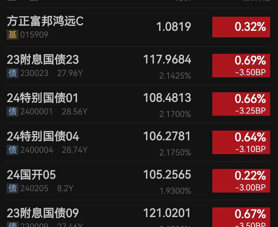 重启国债买卖,利率债要开始收蛋了!从盘面上看长久期利率债领涨,10年红2.5BP,超长红3.8个BP,超长利率债继续吃肉了。产品收蛋情况: $方正富邦鸿远债券C$ 预估80-85蛋,久期比较高,今天看样子也是大蛋,最近每次收蛋都比同类多。 永赢的话:预估70-76蛋,弹性没有方正好。7-10年:16-22蛋; 0-5年:3-6蛋,短端还是受制久期,再涨回暖的话也跑不赢长端利率债,有点可惜。平安的话今天大概率碎10个蛋以上。重启国债买卖这可是大利好啊,债市要开始回血了。