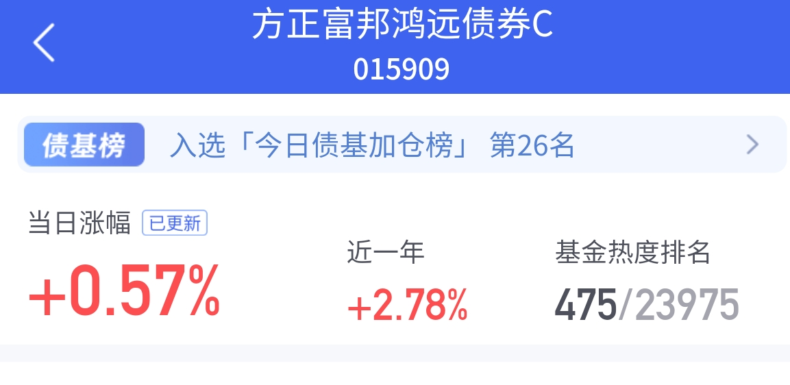 央行重启国债操作,市场预期改善,债市迎来修复窗口。$方正富邦鸿远债券C$今天稳收