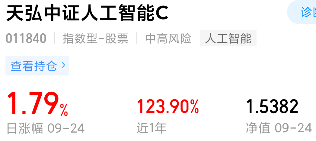 我布局的这只天弘人工智能指数基金,覆盖了中际旭创、新易盛、寒武纪、科大讯飞、中科曙光、海康威视。金山办公、浪潮信息等A股中跟AI高度相关的科技公司,一键打包整个行业,非常方便。基金近三个月上涨了60.08%,近一年上涨了123.90%,赚钱效应非常好。