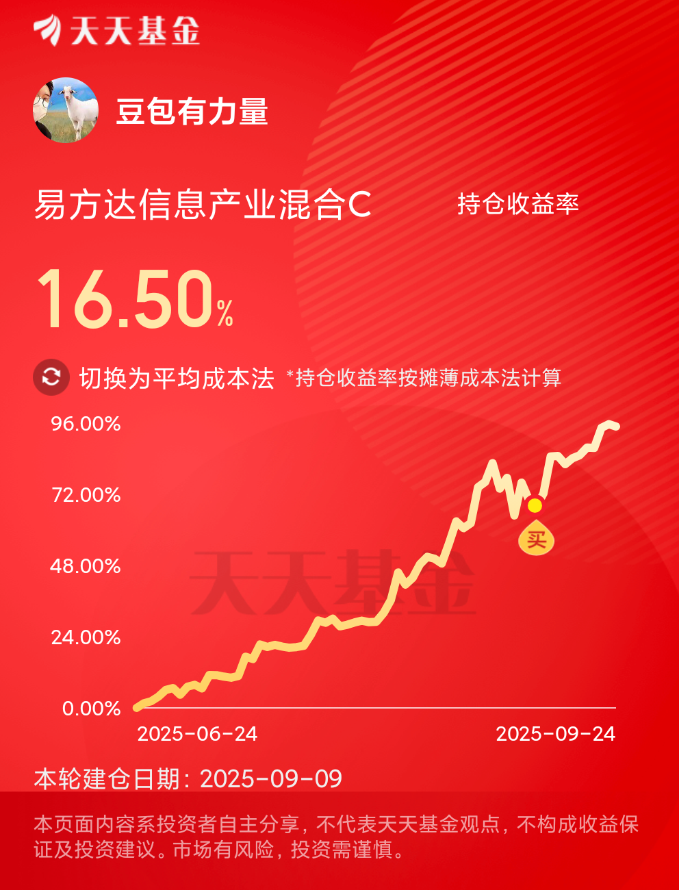 基金近一个月上涨了25.39%,近三个月大涨了94.96%,近一年的涨幅达到了150.72%,赚钱效应好,我前面趁着下跌的时候低吸了一笔,目前持有收益已经超过了16%。