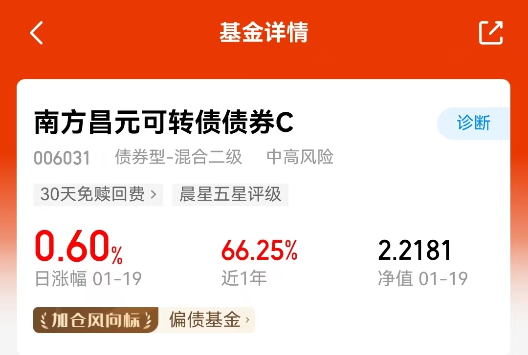 我发现一个现象,很多人要么只敢买纯债,要么就猛冲股票。其实中间还有可转债基金这个选项,比如$南方昌元可转债债券A$(006030)。这基金近一年涨了67%,同类排名是第一。它的增强收益主要来自科技方向的转债,算是在债的底子上加点“料”。好处是市场好的时候,它可能不比一些股票基金差太多,但整体波动会小一圈。不过,这个“料”也决定了它不会风平浪静,波动是常态。所以,别把它当成避风港,更适合作为组合里增强的那一部分,用闲钱投。#暖阳创作计划#