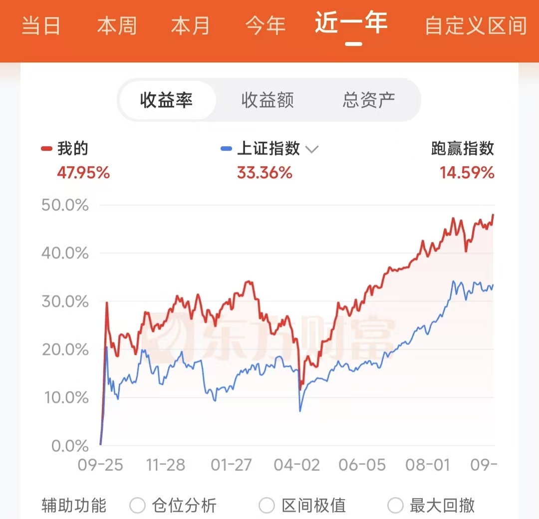 东财账户近一年收益率达到47.95%,主要投资ETF,策略是灵活机动,聚焦科技主题。后续计划将一部分闲钱逐步转移到这个账户中。