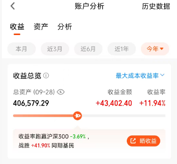 最后复盘一下我的账户情况,天天账户今年以来收益率为11.94%,这主要是因为权益仓位不高,但这个账户的设立初衷就是追求行稳致远,赚自己认知范围内的钱就已满足。
