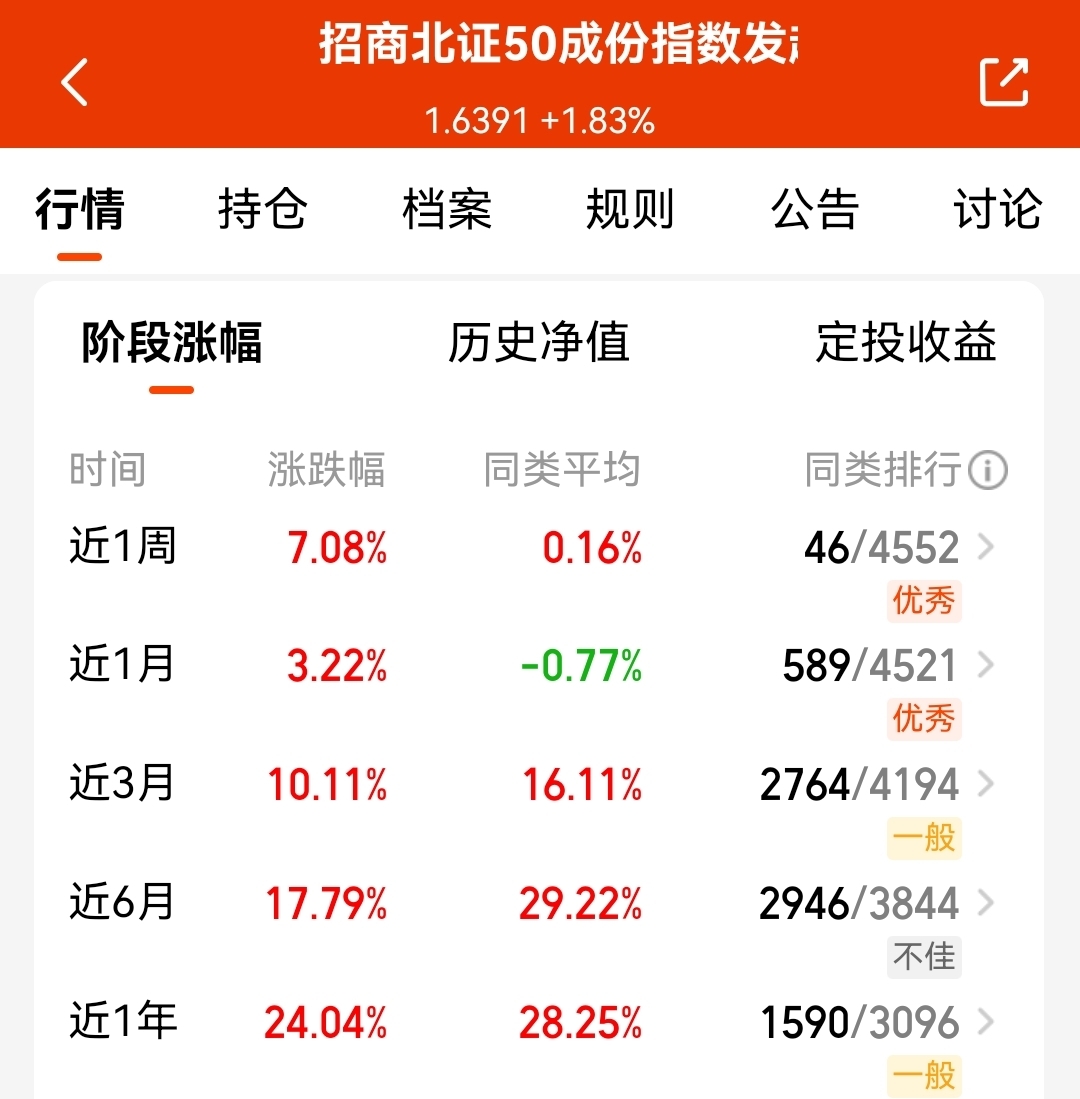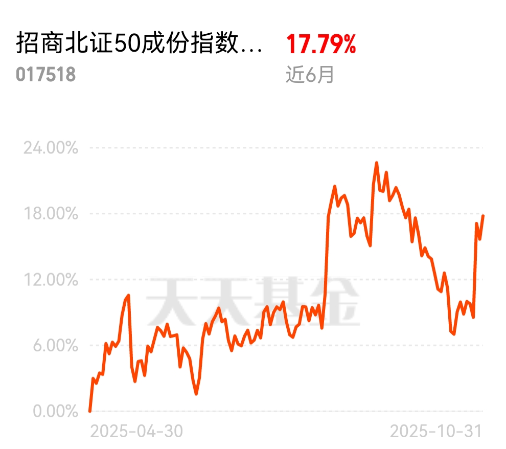 而这支$招商北证50成份指数发起式C$ 也跟踪北证50指数,目前已经连涨3天,近1周收益7.08%,跑赢其他指数了,近1年收益24.04%,我觉得前期调整多,接下来也算是有足够修复空间了,我反正看好长期补涨!