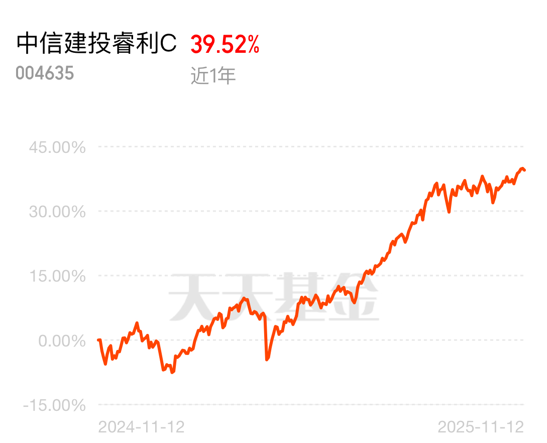 除了天弘创业板ETF联接C,这边还配了点中信建投睿利C,它在氢能、专精特新和新材料上布局扎实,近一年涨了40%,超过大多数同类,回撤收复失地也快。