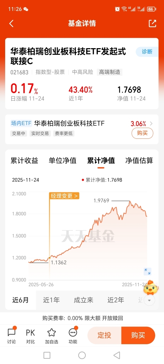 最近创业板这波“深蹲”可把人熬坏了,但昨天一看行情,终于看到点希望!创业板指从最低点拉回来不少,收盘涨了0.31%,更重要的是科技股集体回暖,这说明资金开始偷偷回流了——毕竟创业板的核心就是科技,跌多了肯定要反弹。华泰柏瑞正好是吃科技赛道红利的,之前行情好的时候收益挺亮眼,现在调整完了,跟着它既能蹭板块反弹,又不用担心里面个股踩雷,想借着这波反弹回血的朋友可以看看这个。#军工板块活跃!机构:行业或迎业绩拐点#