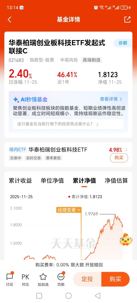 今天创业板指一开盘,科技相关的部分就开始往上走,整个板块的氛围特别好,明显是有资金在进场。华泰柏瑞刚好是跟创业板科技板块绑定的,板块涨它就跟着涨,相当于直接蹭这波创业板的热度。最近创业板的势头这么猛,这基又踩对了方向,想抓创业板科技行情的可以看看它~#今年买基金赚了多少钱?#