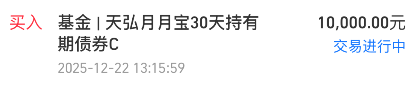 我继续存入$天弘月月宝30天持有期债券C(OTCFUND|022306)$10000元!已经存了20万啦,今天讨论区推荐页面下拉领到包又忍不住存了一笔,敢买成重仓主要是因为又稳业绩又好,最近又连续收蛋,成立1年涨了2.24%,每存10万过去1年就赚224元啦,我觉得比放余额宝香多啦,后面有闲钱我继续存天弘月月宝30天持有期债券C。