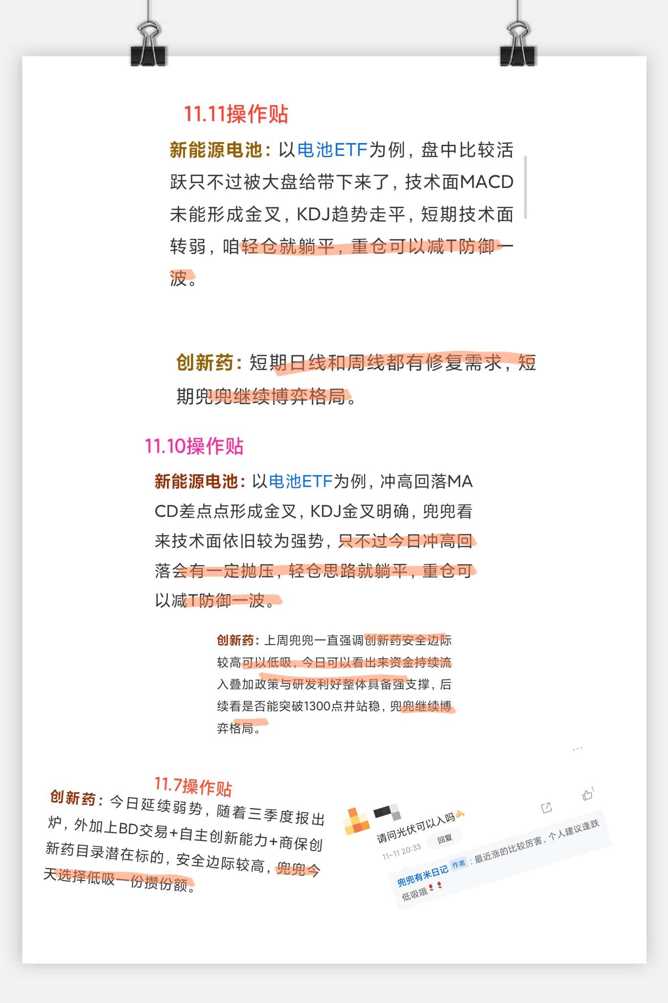 不过兜兜前期提示没白说!昨日、前日反复强调新能源电池重仓可防御减T,有宝子问光伏也提示“不可强上,逢低可吸”这个趋势今天也不建议上车哦;11.7提示低吸创新药,本周也一直说创新药有修复需求,目前看来这些判断全中!按提示低吸的宝子,今天大概率还能有收获!