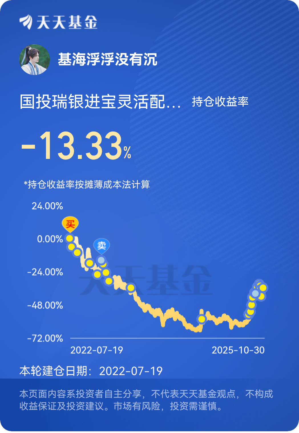 $国投瑞银进宝灵活配置混合$建仓1200天,还亏13.33个点……