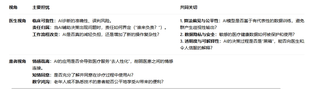 尽管前景广阔,但信任构建面临具体挑战,医患视角既有交集也有差异: