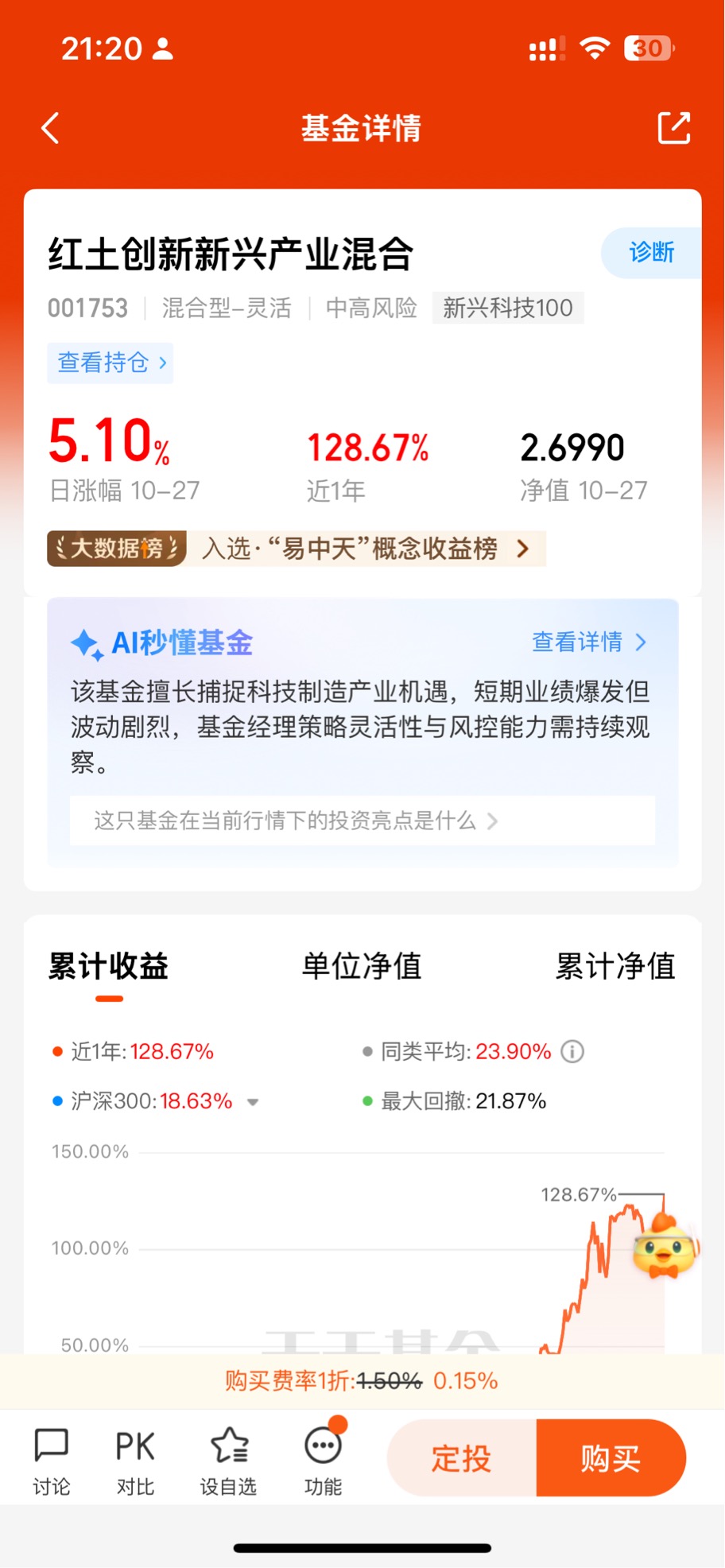红土创新新兴产业混合(001753)今年以来收益率达133.45%,近一年收益也有128.67%,硬核收益直接领跑赛道。