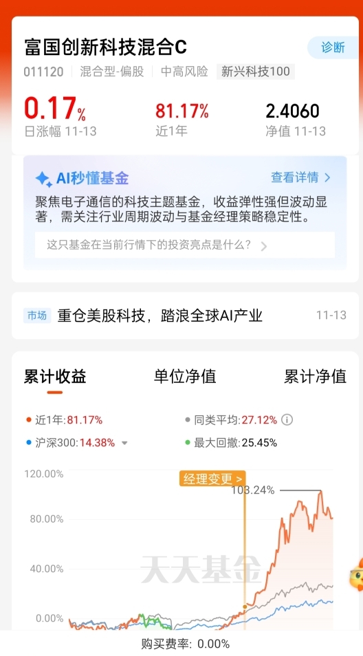 也押注红土创新新兴产业和富国创新科技C,后者持仓AI算力、光模块这些硬核方向,近6个月涨了106%,跑赢多数同类大多数同类,拿得挺安心。