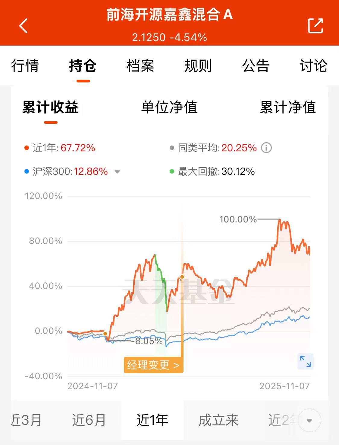 前海开源嘉鑫混合A(001765)“近1年”涨幅达到惊人的67.72%,远超同类平均的20.25%和同期沪深300指数的12.86%,在2262只同类基金中排名高居第73位!