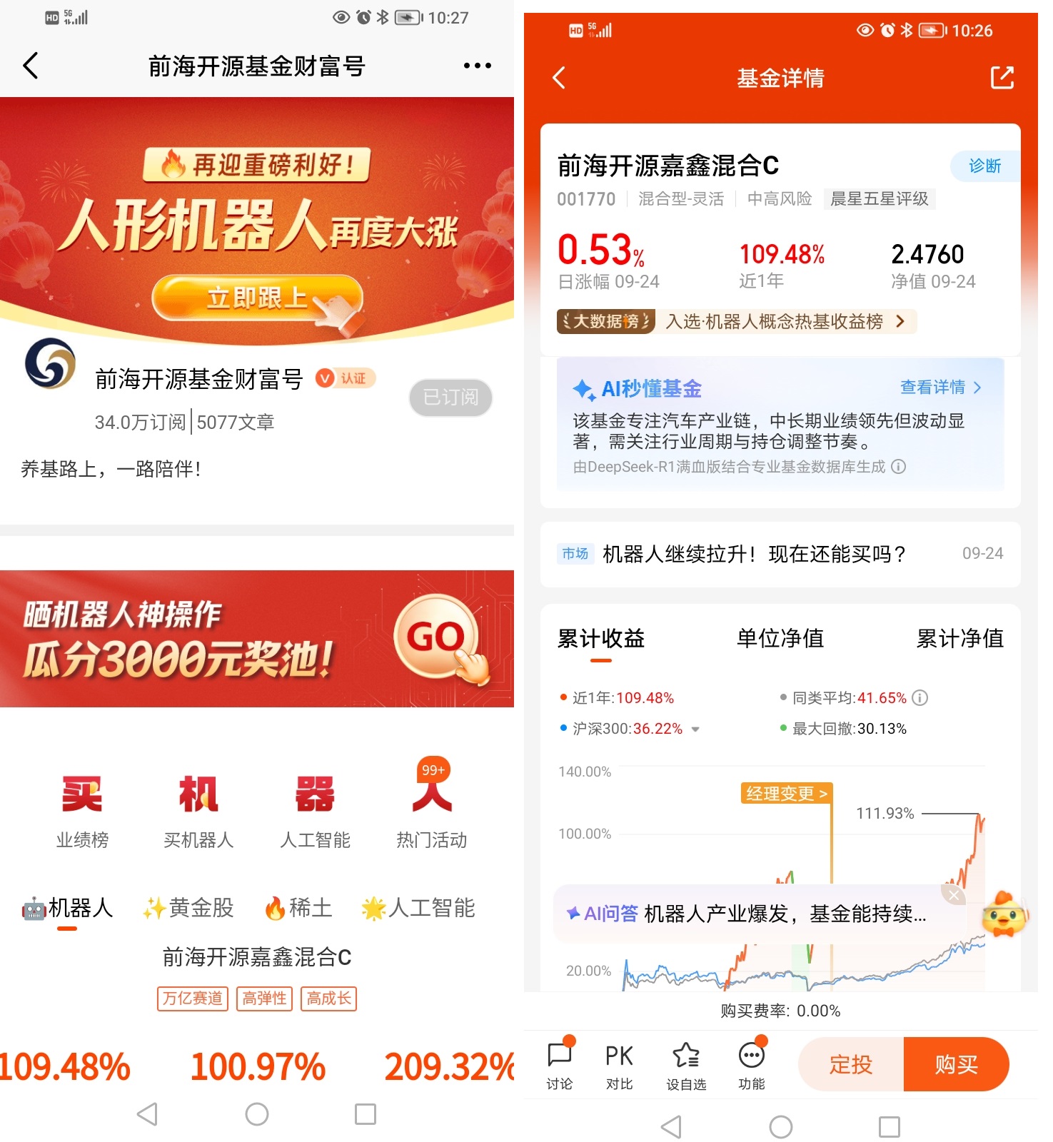 可小周接下来的话,让我动了心:“哥,你看现在工厂里都用机器人干活了,咱们公司车间不也刚换了两台吗?国家现在大力推机器人产业,说是‘十四五’重点,未来五年市场规模能翻三倍!我买的那只前海开源嘉鑫C,代码001770,近一年涨了112%,重仓的全是机器人龙头股,比你死磕工资靠谱多了!”
