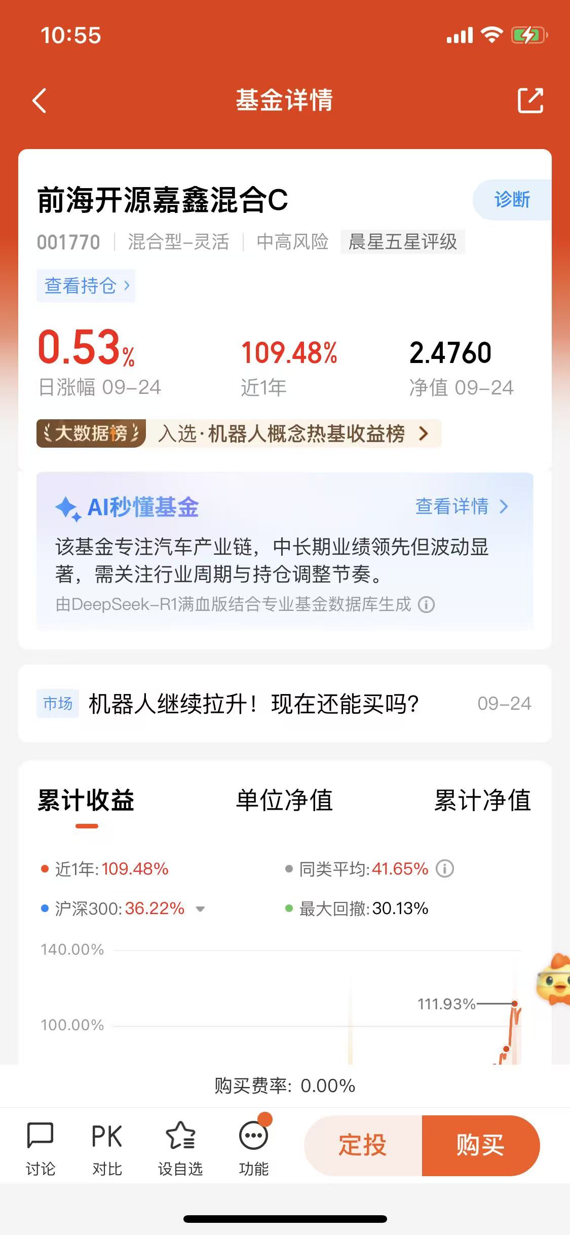 我自己对机器人的看好并不是临时起意。今年1月,我买入了前海开源嘉鑫混合C(001770),这是一只布局机器人相关产业的基金。3月份开始,我又开启了定投,目前整体持基收益率已经达到33.95%。这种体验让我很有信心,定投计划也还在持续,没有停过。投资机器人这个方向,本来就是看重未来几年产业爆发的潜力,而这只基金恰好在节奏上踩得比较准,持有体验算是顺畅的。