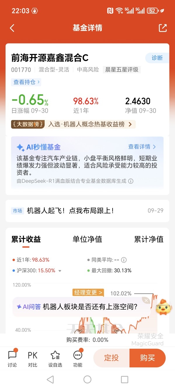 最初注意到机器人,是因为一则新闻。机械臂以超越人力的精度与效率协同工作。我意识到自动化不再是科幻概念,而是切实发生的产业变革。此后我查阅了大量资料,从工业机器人到服务机器人,从核心零部件到系统集成,整个产业链都呈现出蓬勃的生命力。正是在这样的背景下,我关注到前海开源嘉鑫混合C。它的投资组合清晰地聚焦于智能制造和自动化方向,深入产业链上下游。买入后,它确实经历了一段快速上涨,净值表现令人欣喜。但当市场情绪降温,净值出现回撤时,我内心虽然也有波动,但并未慌乱。我没有像过去那样急于“落袋为安”。我深知,任何具有前景的产业赛道都不会是一条直线冲向顶峰,过程中的波折在所难免。我研究过基金经理吴国清的投资思路,他注重企业的核心竞争力和长期成长性,这种风格让我感到安心。我相信,目前机器人产业的渗透率仍处于早期阶段,眼前的回调更像是为了未来更稳健的上涨积蓄能量。过去,我习惯于每日频繁查看净值,心情随之起伏,陷入了短期波动的焦虑中。但持有这只基金,让我逐渐领悟,真正的投资回报,往往来自于对优质资产的长期坚守。我不再试图捕捉每一个微小的波段,而是将目光投向更遥远的未来,关注产业本身的发展进程。这种心态的转变,让我感受到了前所未有的从容。展望未来,我对于机器人技术重塑生产与生活方式的巨大潜力深信不疑。同时,前海开源基金团队在高端制造领域的深厚积淀,也让我对他们的管理能力抱有持续的信心。我期待能继续与这只基金同行,共同见证并分享中国智能制造时代带来的丰厚回报。