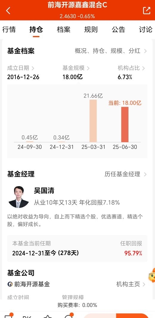 前海开源嘉鑫混合C成立于2016年12月,初始规模较小,但近年来随着业绩爆发,资产规模稳步上升。目前总规模约18亿元,属于中小规模基金,有利于基金经理灵活调仓。