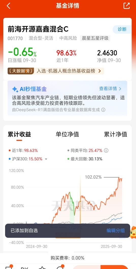 人生中有很多次“后知后觉”的遗憾:想买一只基金,反复研究、权衡利弊、犹豫不决;等到终于下定决心买入的那一刻,市场却仿佛开了挂一般,开始迅猛上涨。而我投资前海开源嘉鑫混合C的经历,正是这样一次典型的“错过在起跑线,追高在半山腰”的真实写照。