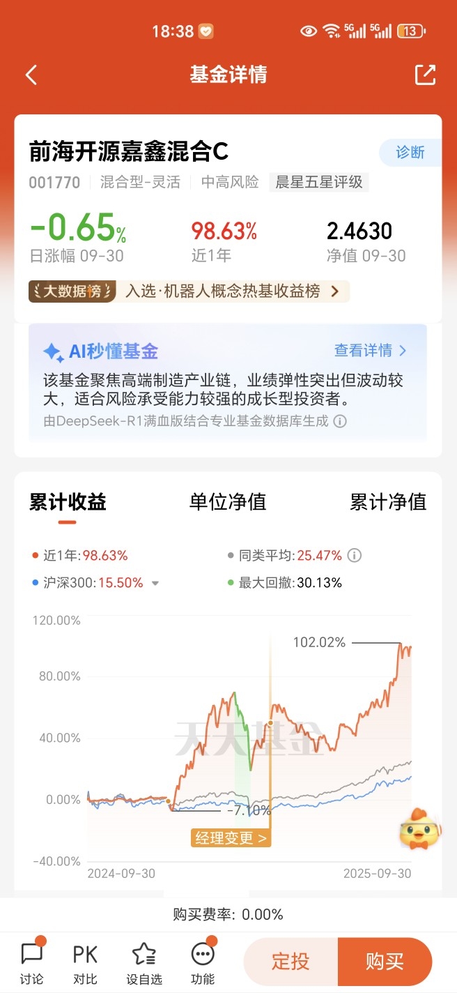 - 业绩表现出色:该基金短期爆发力突出,2025年近3个月涨幅达60.9%,在同类4884只基金中排名第4;近1月涨幅33.60%,超越99.86%同类产品。自成立以来累计净值增长率达269%,年化收益约18.2%,远超同期沪深300指数的年化6.5%。而且在2018年熊市、2020年疫情及2022年市场调整中,年度收益均为正,抗风险能力较强。
