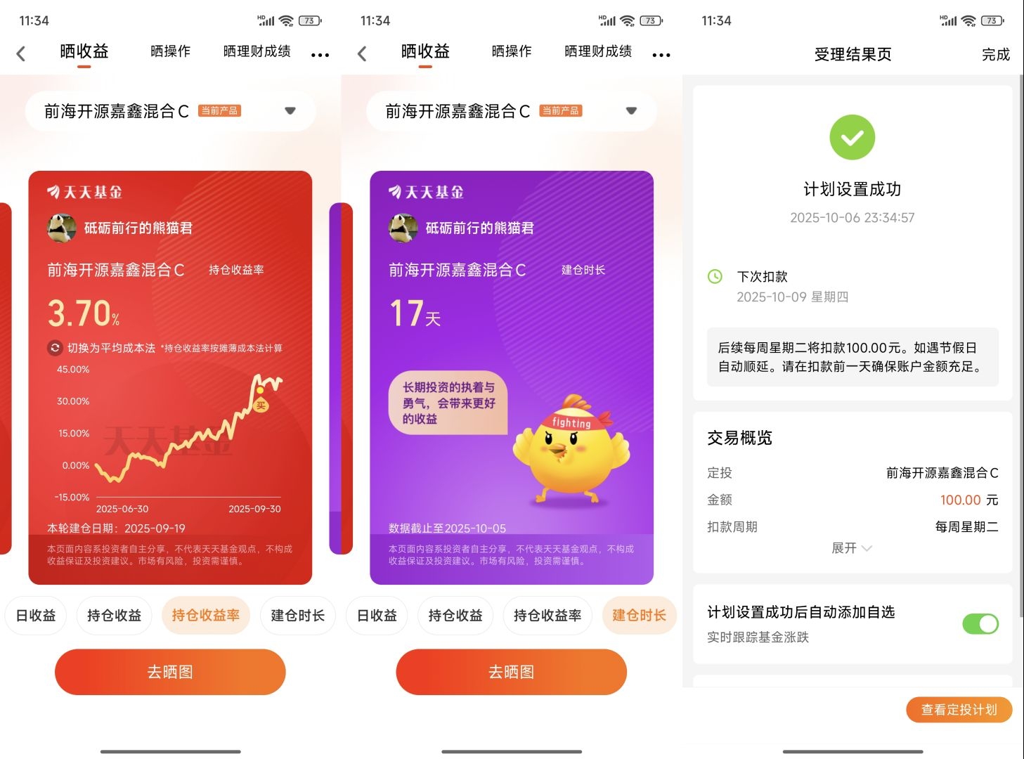 但直接买股票? 看着绿的发慌的账户(去年炒股亏了23%),我选择躺平——定投前海开源嘉鑫混合C,每周100元,用纪律对抗不确定性。