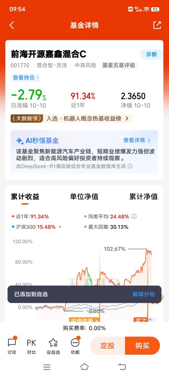 不过持有一年多,我也发现它的“不完美”。最明显的是“跟不上短期暴涨”:今年7月AI板块突然爆发,一周涨了15%,身边有人买的AI主题基金几天就赚了8%,但嘉鑫那段时间只涨了2.1%。我当时也有点慌,忍不住去看基金经理的访谈,他说“不追短期热点,只买能看懂的公司”。后来8月AI板块回调,那些追高的基金又跌了回去,嘉鑫反而因为没碰热点,净值没怎么波动。这时候我才想通,它不是“不会涨”,而是“不赚快钱”——就像种地,不抢着种反季节的菜,而是按节气来,虽然慢,但收成稳。