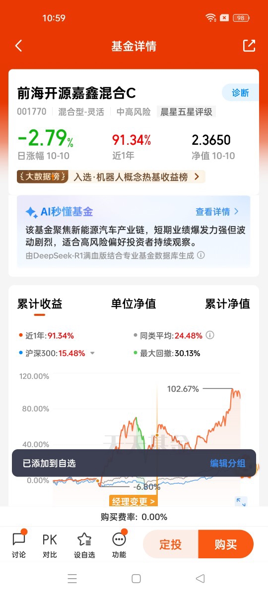周六凌晨刷到美股三大指数大跌的消息时,我第一时间点开基金账户,盯着$前海开源嘉鑫混合C$ 的净值曲线松了口气——截至10月10日,它的单位净值虽微跌至2.3650,但近三个月涨幅仍高达44.65%,在同类排前列 。更关键的是,9月25日美方宣布对机器人及精密组件启动关税调查后,这只聚焦人形机器人的基金仅在26日回调2.76%,29日就反弹3.55%,这种抗波动能力,是我去年踩坑科技基金时想都不敢想的。