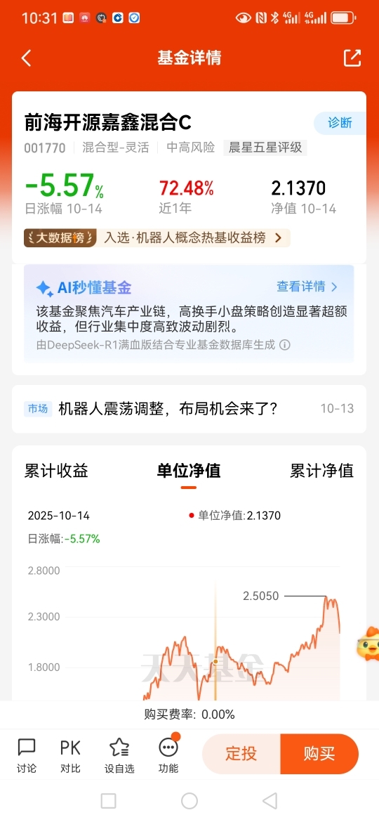 $前海开源嘉鑫混合C$ 这只基金的基金经理以敏锐的洞察力抓住了这个机会,根据市场变化及时调整了持仓结构,2024年四季度果断清仓了消费龙头,转向机器人产业链,大幅提升了前十大重仓股中人形机器人的集中度。并在今年取得了非常好的成绩,给他们点赞,希望他们再接再厉取得更好的成绩来回报广大前海开源基金的投资者。