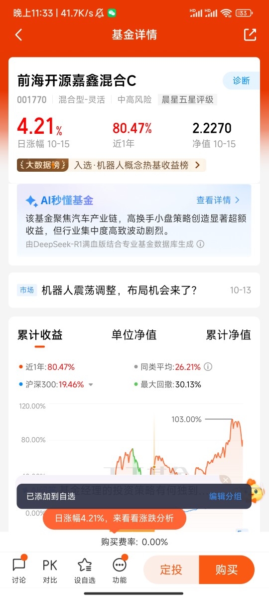 正当犹豫时,朋友推荐了前海开源嘉鑫混合C。研究后发现,这只平衡型基金的灵活配置属性恰好契合我的需求——基金经理吴国清擅长根据产业趋势调整仓位,2024年底就已悄悄布局机器人产业链核心标的 。更打动我的是,吴国清注重基本面研究,会从技术突破、订单情况、估值水平等多维度筛选企业,这比我自己盲目跟风可靠多了。2025年初,我果断入手了这只基金,开启了机器人投资之旅。