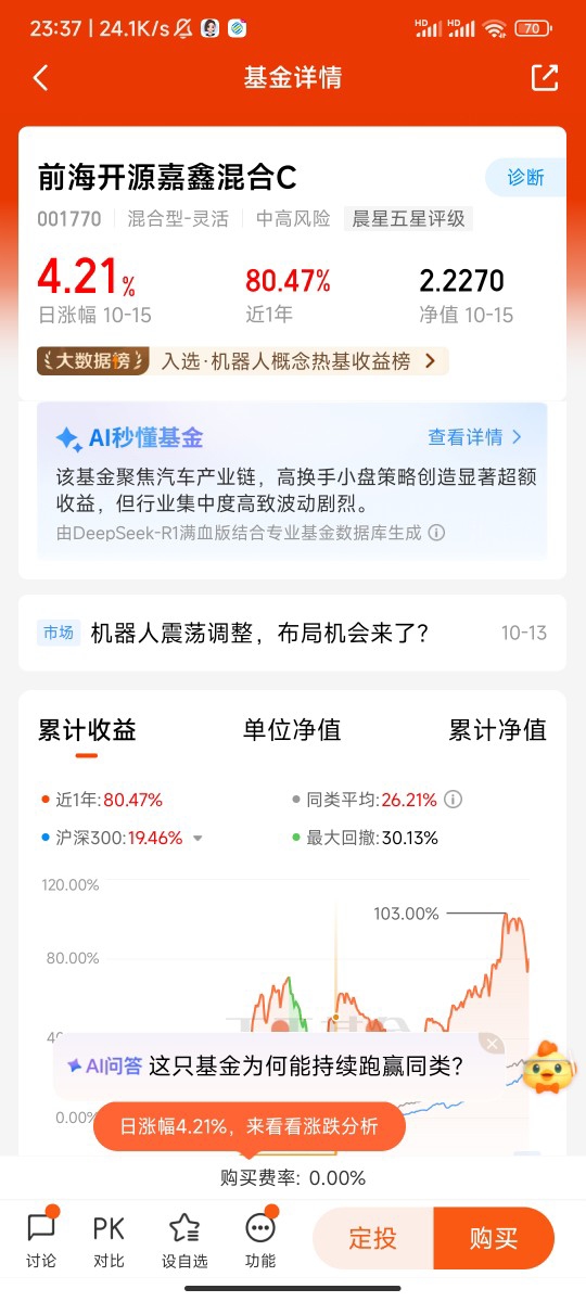 但作为投资新手,我犯了难:直接买个股风险太高,自己又不懂复杂的财务分析,生怕踩雷。直到去年下半年,我在研究基金时发现了前海开源嘉鑫混合C,看到它的重仓方向集中在机器人产业链,瞬间眼前一亮。这只基金的持仓里,既有汇川技术这样的工业自动化龙头,也有绿的谐波这种核心零部件企业,覆盖了从核心部件到整机制造的全产业链,正好契合我对机器人行业的判断。而且C类份额免申购费,持有满7天还能免赎回费,对于我这种想长期持有又怕短期波动的普通投资者来说,门槛低、灵活性高,再合适不过。