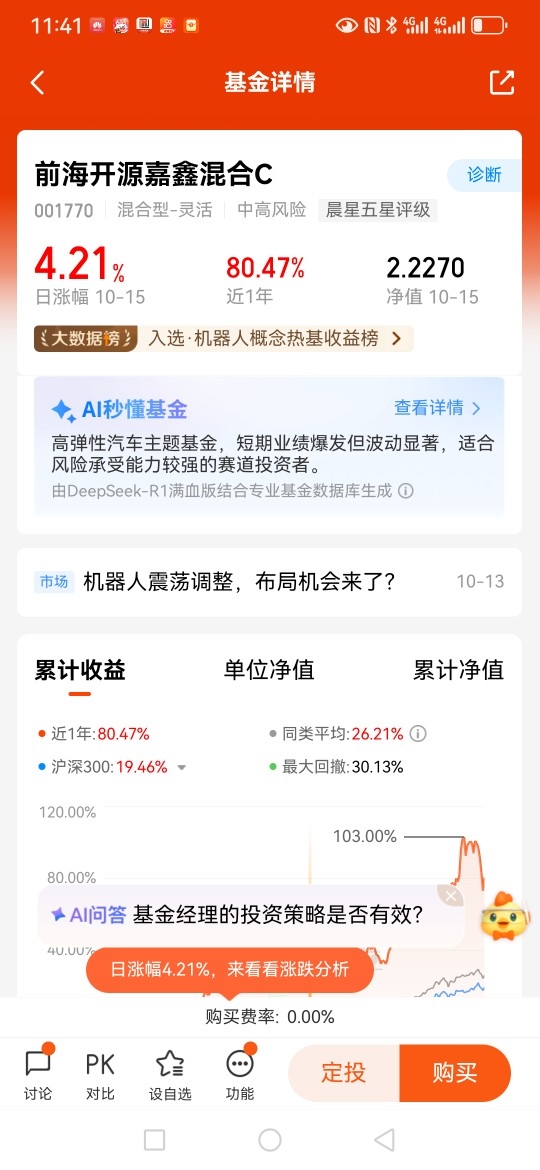 所以,机器人基金在当前市场环境下具有较高的投资价值,但投资者在进行投资决策时,应充分考虑市场风险和个人风险承受能力,谨慎选择投资标的。$前海开源嘉鑫混合C$ ,概念纯正,规模不大,适合普通中小投资者参与,可以重点关注。