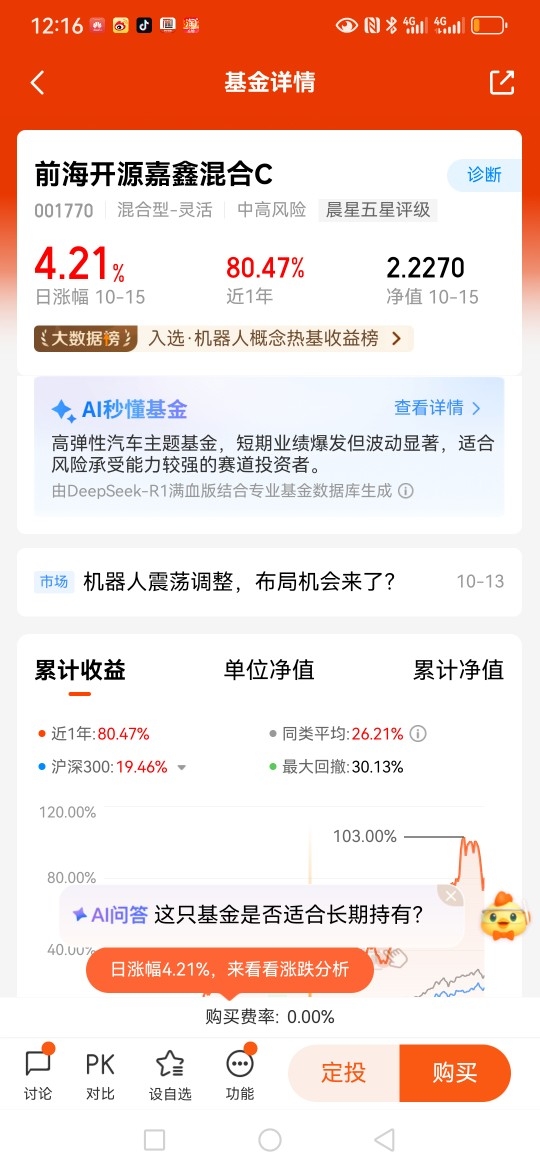 所以,我也是跟着目前的行情投了一些$前海开源嘉鑫混合C$ ,没有什么太神的操作,只是简单定投。因为我非常看好这个赛道,近期海外聊天机器人火热,国内相关企业不断签订产业订单,AI不断助力机器人产业发展,国产供应链有望充分受益,可以长线看好。