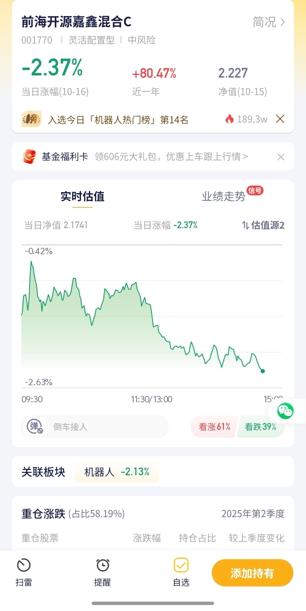 【前海开源嘉鑫混合C基金估值播报+10.16行情】前海开源嘉鑫混合C今日估算跌幅-2.35%!收益提前看+该混合基金今日回调明显. 今日A股呈现分化格局,部分板块表现突出,部分板块表现疲软,大家投资可得擦亮眼睛。