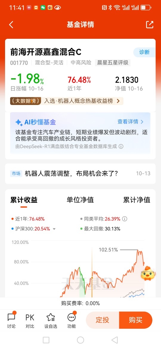 尽管短期市场可能会有波动,但是不会改变这些领域长期发展的一个趋势。目前仍然坚定看好机器人,还有智驾等先进制造领域未来的发展机会。根据过往经验来看,科技成长板块呈现出比较高的波动性和周期性,对个人投资来讲难度很大,所以还是建议大家,把专业的事情交给专业的人来做,通过投资基金的方式来参与,$前海开源嘉鑫混合C$ 可能是一个很好的选择。该基金重仓人形机器人,是现在的热门赛道,波动虽然比较大,修复的也非常快,可以采取定投的方式进行投资,会有不错的收益。