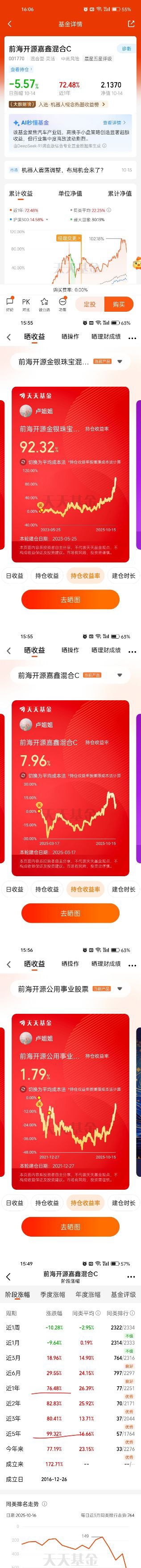 我记得2月12日参加前海开源家测评这只宝藏基活动之时,本基金近一年收益率46.44%,截至3月5日近一年收益率63.72%,不到一个月时间溢价收益率17.28%,精准捕获行情,涨势喜人。截至2025年10月16日,该基金年内收益率达80.76%,远超同类平均水平23.50%(同期沪深300涨幅约17%)。2月17日该基金单日上涨5.88%,2月19日更是涨了9.28%,不难推测基金经理主动管理能力超群,捕捉到主题投资的大风口。我是3月份逢低买入,盈利后又买入目前盈利7.96%。